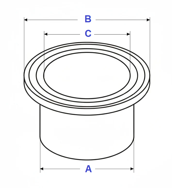 | Clamp Size | Tube Outer Diameter (A) | Flange Outer Diameter (B) | Tube Inner Diameter (C) |
